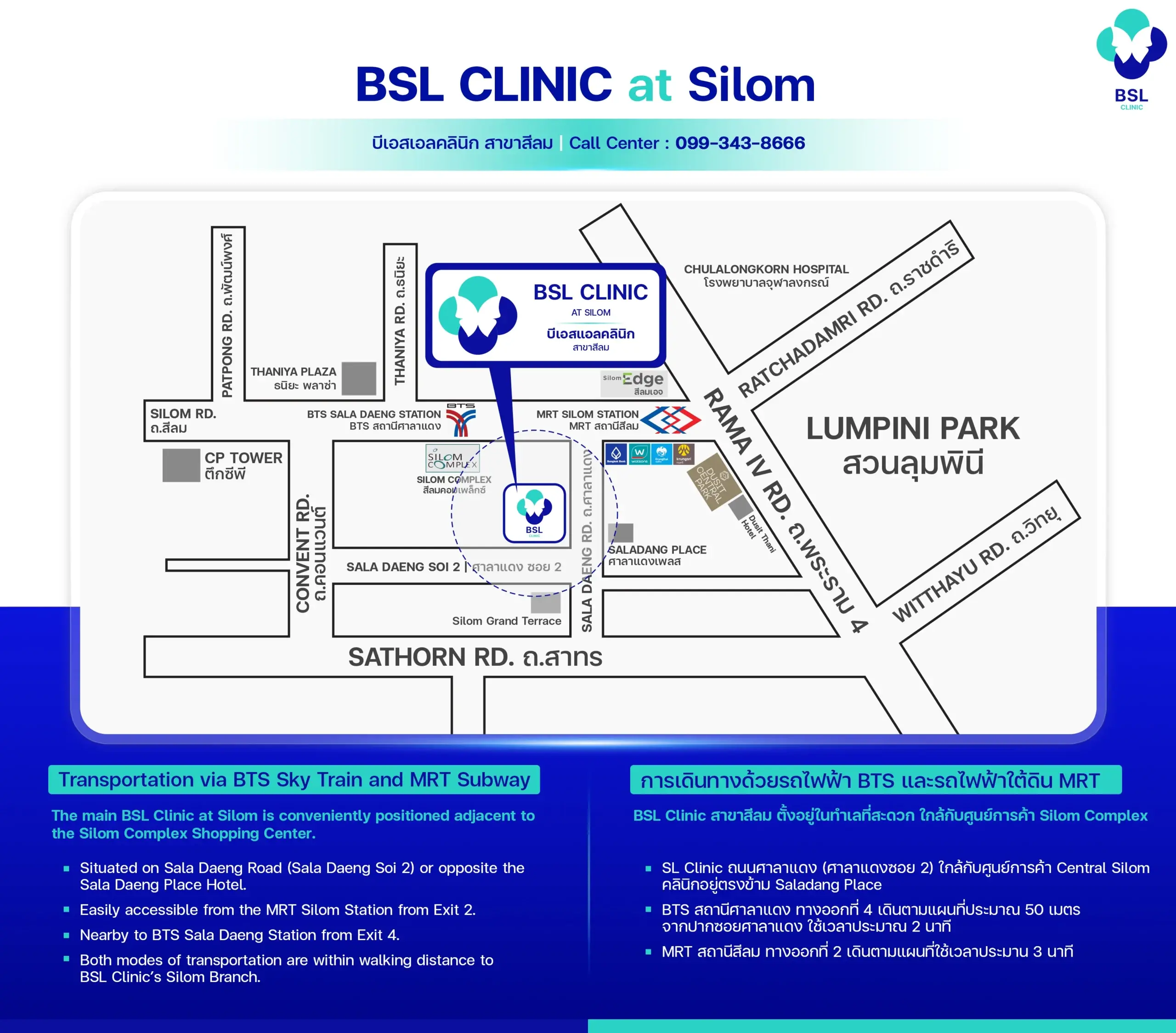 BSL Clinic Silom is located at 30/8 Saladaeng Soi 2, Silom Road, Bangrak, Bangkok 10500, opposite Saladaeng Place and near Silom Complex.