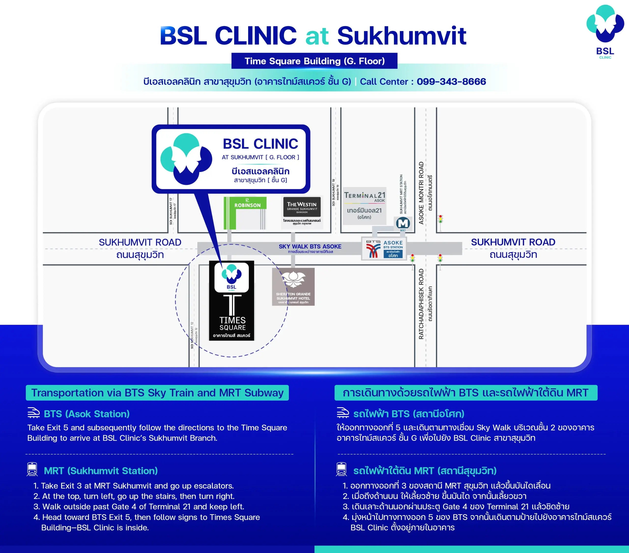 BSL Clinic Sukhumvit is located on the Ground Floor of Times Square Building, Sukhumvit Road, Khlong Toei, Bangkok 10110.